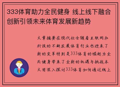 在现代社会,随着互联网和科技的不断发展,体育行业也迎来了新的变革。特别是333体育的崛起,为全民健身带来了全新的机遇与挑战。本文将深入探讨333体育如何通过线上线下融合的创新模式,助力全民健身,推动未来体育发展的新趋势。通过分析四个主要方面,本文将阐述线上线下融合在体育领域中的重要性,如何通过技术和平台创新促进健身活动的普及,以及这一模式在未来可能带来的深远影响。文章首先对333体育的基本理念与优势进行概述,然后深入分析线上线下融合的实践意义,探讨全民健身的新形态与其对社会健康的推动作用。最后,通过对未来体育发展趋势的预测,文章总结了333体育在全民健身中的关键作用与发展潜力,揭示了其在推动健康中国战略中的重要贡献。