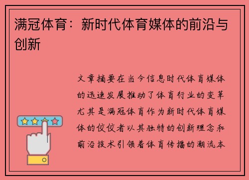 在当今信息时代,体育媒体的迅速发展推动了体育行业的变革,尤其是满冠体育作为新时代体育媒体的佼佼者,以其独特的创新理念和前沿技术,引领着体育传播的潮流。本文将从四个方面详细探讨满冠体育在新时代体育媒体中的前沿与创新。首先,满冠体育在内容创作与传播方式上的革新,展示了如何打破传统体育报道的局限,融合数字化与互动性,吸引年轻观众的关注。其次,满冠体育通过精准的用户数据分析,优化体育媒体内容的推送,形成了独特的内容定制化模式。再者,满冠体育在多平台联动与技术运用方面,利用AI、大数据等前沿科技手段,提升了体育观众的沉浸式体验,进一步拉近了体育与观众的距离。最后,满冠体育通过多样化的商业模式探索,为体育媒体行业的可持续发展提供了新的思路和实践,推动了体育产业的繁荣与发展。通过这四个方面的分析,本文全面呈现了满冠体育在新时代体育媒体领域的创新与领先地位。